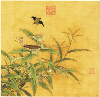 李迪(大约12世纪),生卒年不详。河阳(今河南孟县)人,为南宋孝宗、光宗、宁宗三朝画院画家。先后任职于宫廷画院,擅长花鸟、鱼虫犬猫等题材,是南宋早期宮廷花鸟竹石题材的杰出画家。《秋卉草虫》(台北“故宫博物院”藏)这幅画中,螳螂高举双臂欲捕食金龟子,金龟子及时察觉后,立即振翅而飞……该画极准确地勾勒晕染出昆虫追逐与逃脱的生死瞬间。而画中细腻精致的色彩及变换,充分展现了宋徽宗时宫廷画院追求设色与质感兼具的风格。