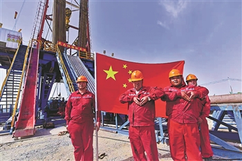 国庆期间,中石化西北油田采油三厂的职工们坚守在大漠戈壁,加快千万吨油气田建设。图为石油工人给祖国献上祝福。石立斌 摄