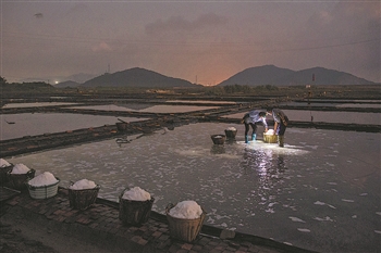 凌晨两点,当很多人还在熟睡的时候,在浙江省宁波市北仑区白峰街道外峙村的盐场上,晒盐工头戴探照灯帽子,脚穿雨鞋,手拿盐耙,在黑暗中开始了一天的劳作。