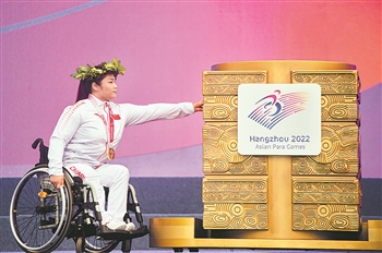 10月9日,东京残奥会举重冠军谭玉娇在活动上按动按钮,揭晓杭州亚残运会火炬形象。当日,杭州2022年第四届亚残运会倒计时一周年主题活动在杭州市杨绫子学校举行。