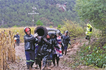 汛期以来,陕西黄陵地区遭遇持续强降雨。位于黄陵县店头镇的陕煤集团黄陵矿业也遭遇强降雨侵袭。面对灾情,黄陵矿业上万名职工投入抢险工作,确保矿区生产生活秩序平稳。图为黄陵矿业职工在抢险救灾。