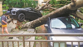 10月13日,在海口世贸雅苑小区,被台风刮倒的树木砸在小汽车上。