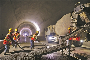 图为13日上午,中铁二十二局集团几名工人正在榆安二号隧道进行最后一处混凝土浇注作业。窦曼 摄