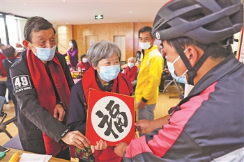 10月13日下午,在重阳节到来之际,北京市东城区北新桥街道“幸福金婚映百年,情暖重阳在新桥”敬老月主题活动在新太仓胡同举行,负责附近快递配送的快递小哥王吉龙为金婚代表张九龄夫妇献上福字,庆祝金婚。