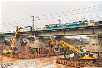 10月13日,施工人员在南同蒲铁路昌源河大桥抢险现场作业。