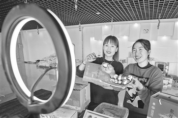 10月12日,在河北省黄骅市聚馆村一家农产品公司,工作人员在进行网络直播销售。目前,黄骅冬枣产业年产值达11亿元,有效带动当地群众增收致富。 新华社记者 骆学峰 摄