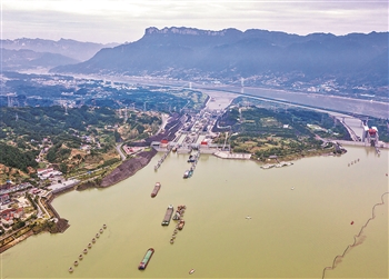 据长江三峡通航管理局数据,2021年前三季度,三峡枢纽通过量1.1亿吨,同比上涨14.37%。图为船舶有序通过三峡五级船闸。新华社发(郑家裕 摄)