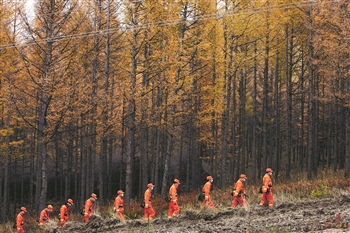 10月9日,塞罕坝林场专业扑火队的队员们正在林间巡护。2002年,为了保证林场安全,塞罕坝林场以退伍军人为班底组建了这只专业扑火队。