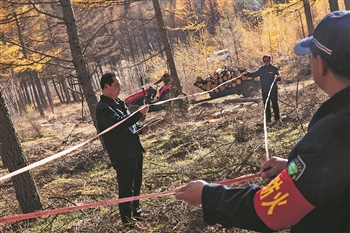 10月11日,蓝天白云下的一片林区里,林场设计院的测量人员正为样方里的树木进行胸径测量,为今冬明春的工作规划打基础;林区外的柏油路上,一位新入职的大学生正挥动着印有防火字样的小旗,不时提醒路过的车辆“注意防火”;而此时的吕振军和他的同事们已经在林区巡护了十余公里……