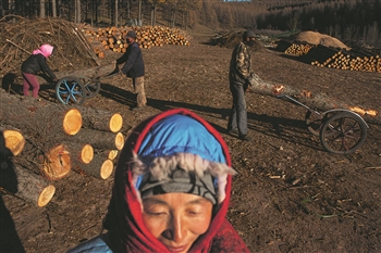 10月10日,塞罕坝四道沟营林区楞场,搬运工把原木按一定标准摆放好后,女职工宋淑燕(图中)正在进行统计。
