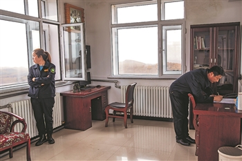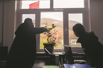 10月9日,塞罕坝四道沟营林区的办公室内,吴晨刚(图左)给即将执行巡护任务的徐颖布置工作。