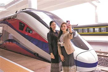 10月16日,两名女子在老挝万象站与“澜沧号”动车组合影。