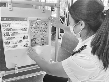 山东青岛的一辆公交车上,工作人员正在张贴反诈宣传海报。视觉中国 供图
