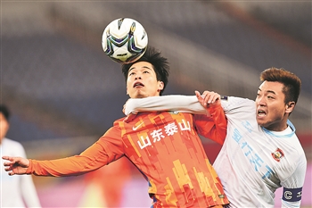 10月18日,青岛青春岛队球员田勇(右)与山东泰山队球员段刘愚在比赛中争球。当日,在2021赛季中国足协杯(济南赛区)第二轮比赛中,山东泰山队以3比0战胜青岛青春岛队,晋级八强。新华社记者 朱峥 摄