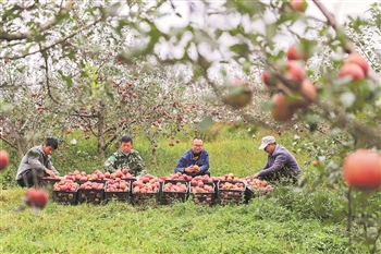 10月21日,在贵州省威宁彝族回族苗族自治县牛棚镇龙山种植专业合作社的苹果园,曹杰(右二)和父亲曹宣明(左二)将刚采摘的糖心苹果装筐。曹杰和父亲的苹果园不仅给他们增加了收入,还为当地村民提供了10多个长期就业岗位和50多个临时就业岗位,受益村民中还包括6位残疾人,果园被村民们称为“爱心苹果园”。新华社发(韩贤普 摄)