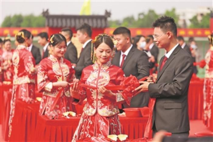 参加集体婚礼的64对新人是来自中铁上海工程局在全国各地各系统的青年职工。大家身着盛装,先后进行了却扇礼、交拜礼、沃盥礼、同牢礼、合卺礼、结发礼、执手礼、定情礼和宣誓礼等仪式,许下爱的誓言。本报通讯员 张笑铭 摄