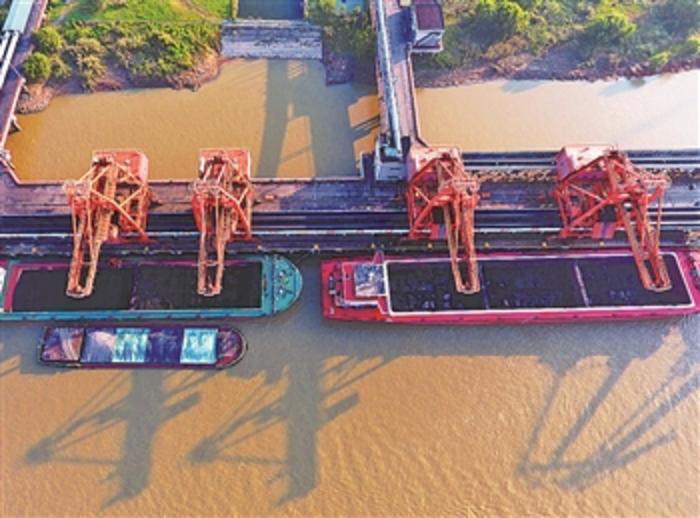 图为10月24日,在位于九江市濂溪区的江西省煤炭储备中心的长江码头,工人们正在将货船上的电煤通过传输带装到铁路专用线的货物列车上。胡国林 杨锐 摄