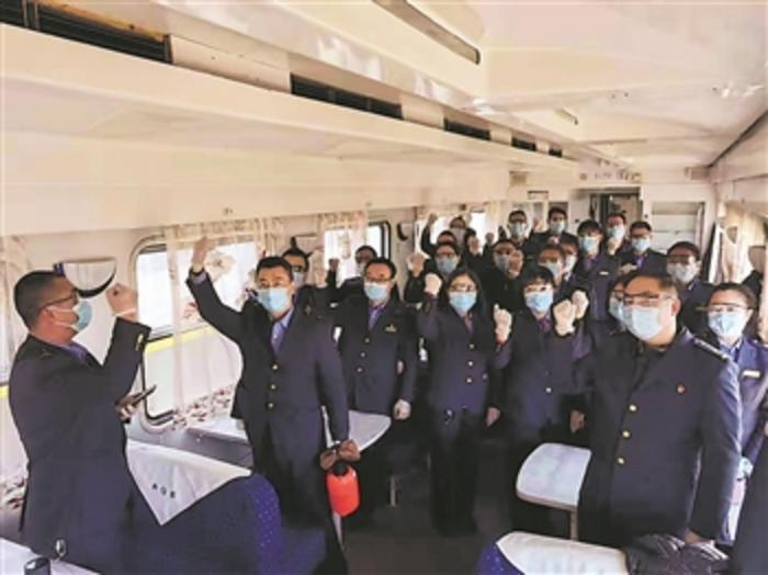 10月19日,列车员们齐喊战胜疫情的口号。王当涛 摄