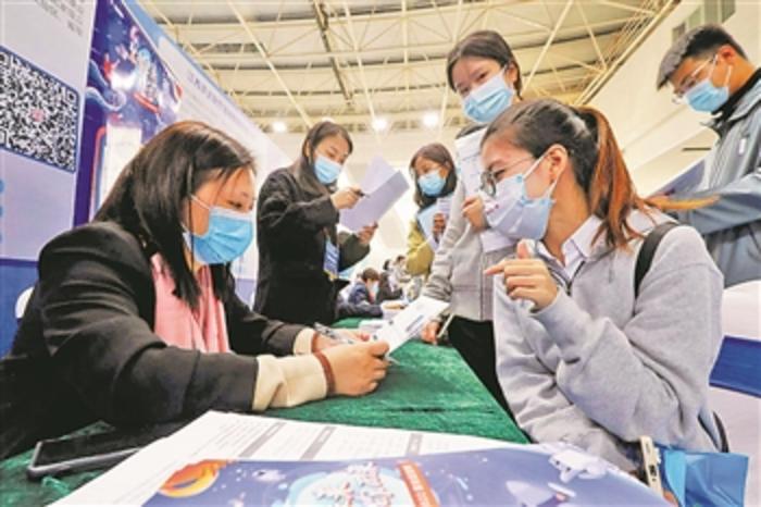 10月23日,求职者在南昌大学校园招聘活动现场求职。当天,江西南昌市10万人才来昌留昌创业就业“百场校招”启动活动在南昌大学前湖校区举行。此次活动分为1个主会场和3个分会场,进场企业超530家,提供就业岗位数超3.2万个。刘占昆 摄/东方IC