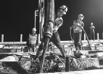 10月27日,在贵南高铁广西段八仙双线特大桥施工现场,施工人员在对轨道浇灌混凝土。