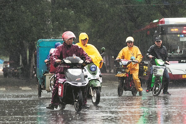 雨天,外卖骑手在北京的一个路口等绿灯。本报记者 王伟伟 摄