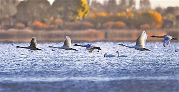 10月31日,白天鹅在河口水库湿地飞翔。