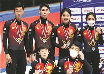 10月31日,在日本名古屋举行的2021-2022国际滑联短道速滑世界杯名古屋站中,中国选手任子威获得男子1000米冠军。上图为任子威(前)在比赛后庆祝。中国队获得2000米混合接力银牌。下图为中国队选手在颁奖仪式上。新华社记者 杜潇逸 摄