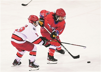 10月31日,北京队球员姜博文(右)与上海队球员聂芯蕊拼抢。当日,在吉林省吉林市举行的2021年全国女子冰球锦标赛决赛中,北京队以6比1战胜上海队,夺得冠军。