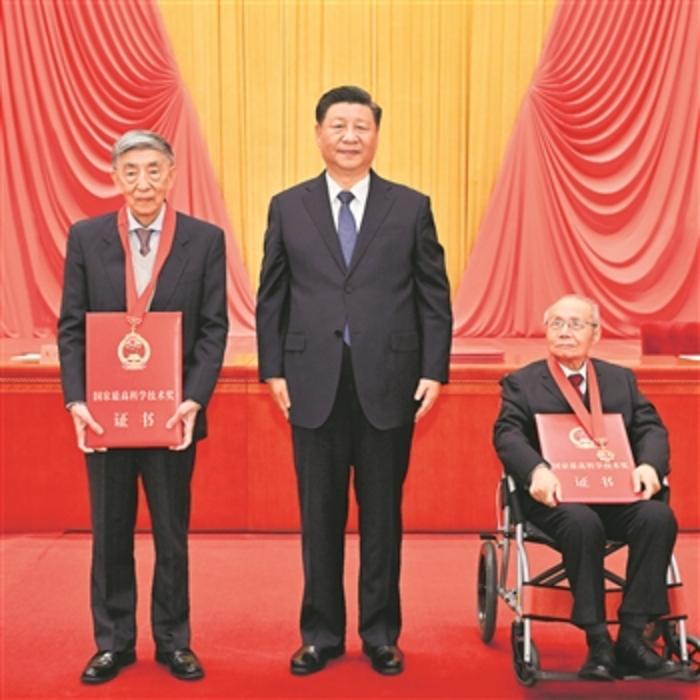 11月3日,习近平向获得2020年度国家最高科学技术奖的中国航空工业集团有限公司顾诵芬院士(右)和清华大学王大中院士(左)颁奖。新华社记者 李学仁 摄