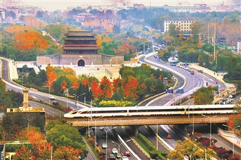 时值深秋,五彩斑斓的树叶将北京装扮得格外美丽。图为游客欣赏北京中轴线上的秋日景色。牛云岗 摄
