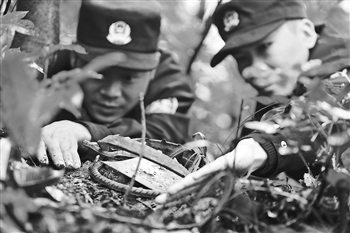 10月20日,湖北省宜昌市秭归县公安局水田坝派出所民警,在山中侦察发现1副架设并已启动捕杀野生动物相应机关的铁夹。当日,民警缴获杨某、向某用以非法狩猎的15副铁夹,以及被其猎杀、肢解的果子狸、野猪两种野生动物残骸。吴令剑 摄/人民视觉