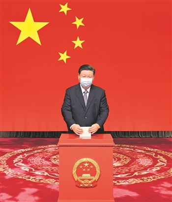 上午10时30分许,习近平来到怀仁堂投票站,仔细听取有关选举事项的说明,拿出选民证交给工作人员核验,领取一张选票,在写票处认真填写选票后,走到票箱前郑重投下自己的一票。
