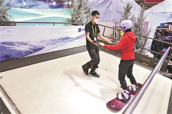 11月5日,参观者在进博会消费品展区的一家展台体验滑雪。