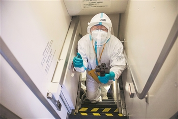 2021年4月7日,沈阳民航传媒公司宣传干事孙楠身着防护服,在德国汉莎入境沈阳的航班上采访。陈松 摄