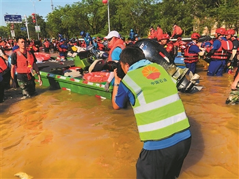 2021年7月26日,河南卫辉,《中国石油报》记者张旭在洪水中拍摄人民子弟兵救援群众的场景。受访者供图