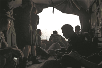 2021年7月24日,河南省新乡市,光明网记者季春红(右二)乘坐军车前往漫堤处采访。王敬 摄