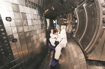 2021年4月28日,《合肥日报》记者张大岗在中国科学院合肥物质科学研究院等离子所全超导托卡马克核聚变实验装置内部采访拍摄。受访者供图