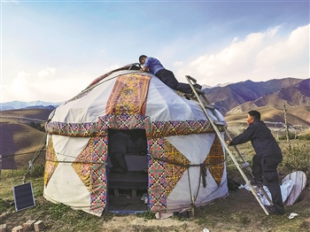 2021年9月18日,在中秋节来临之际,霍尔果斯边境管理大队政治工作室民警王鹏飞来到当地哈萨克族牧民居马拜·托合塔尔家,爬到毡房顶上拍摄房内过节场景。受访者供图