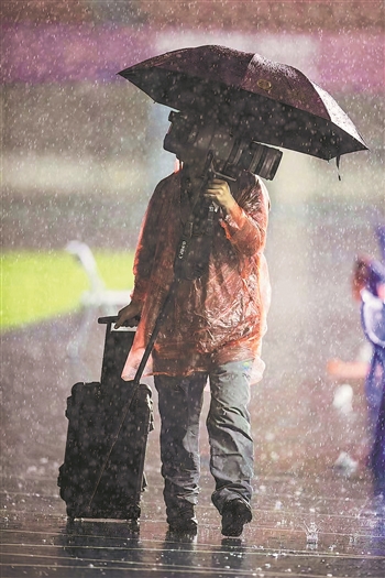 2021年9月25日晚,《陕西日报》记者杨小兵拍摄完第十四届全运会女足决赛后离开陕西省体育场。在本届全运会举办期间,西安降雨不断,很多记者都在雨中采访、拍摄。赵晨 摄