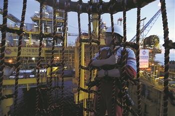 2021年6月22日,我国首个自营超深水大气田“深海一号”投产前夕,《中国海洋石油报》记者李彦昭乘坐吊笼登上矗立在南海中央的平台,见证历史时刻。受访者供图