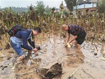 2021年10月29日,在四川省内江市东兴区高梁镇方家沟村,东兴区区委宣传部对外宣传中心工作人员唐明润(图左)正在拍摄村民采收莲藕。周雪梅 摄