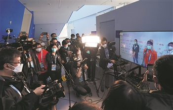 2021年10月8日,在国家速滑馆举办的“相约北京”速度滑冰中国公开赛结束后,记者们通过5G信号在屏幕前对运动员进行“云采访” 。刘平 摄