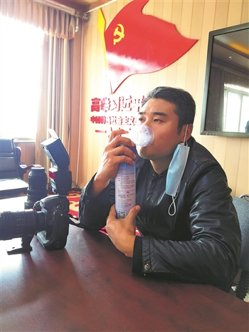 2020年9月27日,西藏那曲,《嘉兴日报》记者冯玉坤发生严重高原反应,抱着氧气罐完成对浙江嘉兴援疆干部的采访拍摄。姜鹏飞 摄