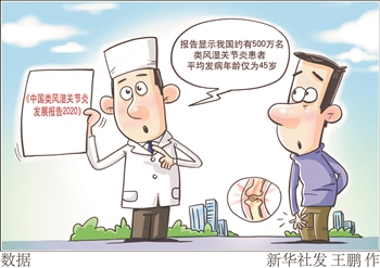 近日,国家皮肤与免疫疾病临床医学研究中心(NCRC-DID)发布《中国类风湿关节炎发展报告2020》。报告显示,据初步估计,我国目前约有500万名类风湿关节炎患者,平均发病年龄只有45岁。新华社发 王鹏 作