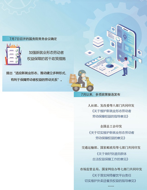 常凯:7月7日的国务院常务会议提出的“适应新就业形态,推动建立多种形式、有利于保障劳动者权益的劳动关系”,为平台用工治理定下了原则和方向。相关政府部门在7月出台了一系列文件,提出对于平台劳动的法律规制要求。半个多月时间内,各部委如此密集地出台同一议题的文件实为罕见,可见中央对于平台用工治理的急迫和重视。