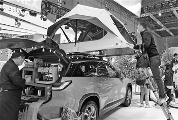 11月6日,参观者在进博会展馆里参观车顶帐篷。