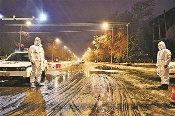 11月8日,在哈尔滨市平房区一进出城卡点,两名公安人员在冻雨中执勤。