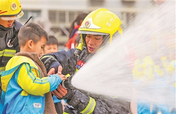 11月9日,在贵州省铜仁市玉屏侗族自治县实验幼儿园,孩子们在体验消防设备的使用。当日是全国消防日,各地开展消防安全宣传活动。新华社发 (胡攀学 摄)