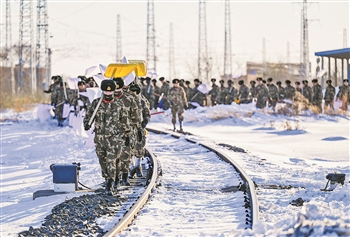 11月11日,在中铁沈阳局集团有限公司通辽站南编组场,武警官兵准备清理积雪。