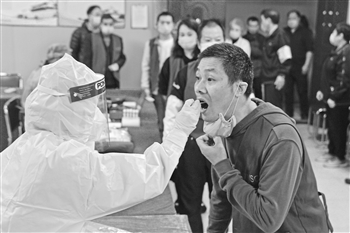 近日,北京市新民菜市场的一间会议室内,核酸检测机构的工作人员正在为菜商进行核酸采样。